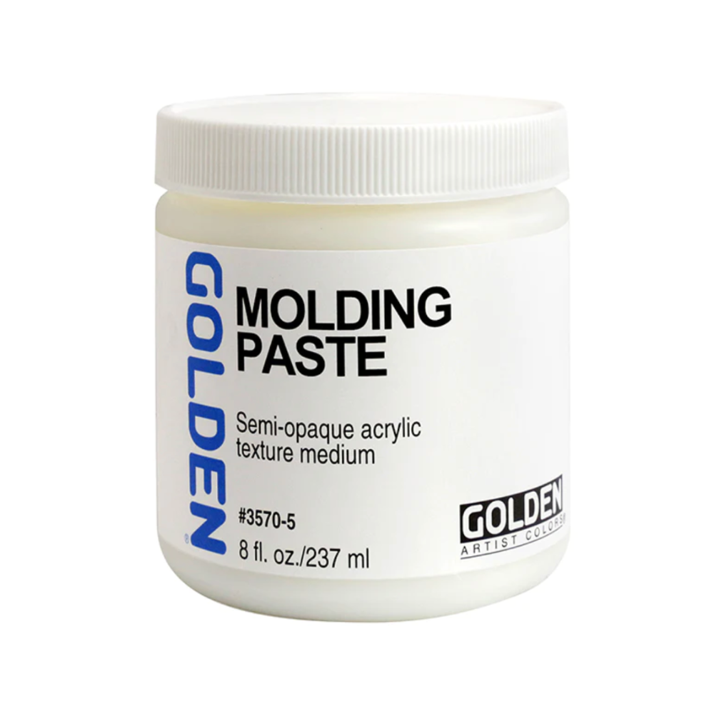 GOLDEN Molding Paste is similar to the consistency of GOLDEN Heavy Gels, yet the marble dust solids impart a unique feel due to the material's higher density. It is an opaque gray product that dries to a semi-gloss sheen. When used alone or mixed with other products, such as GOLDEN Heavy Body Acrylics, it offers a hard yet flexible film. Capable of holding good peaks, Molding Paste is excellent for building surfaces or creating textures.