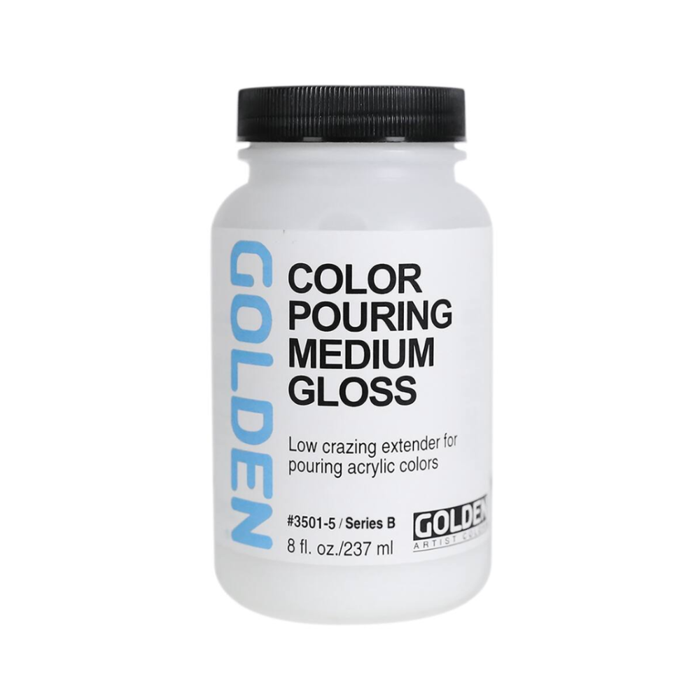 Golden Colour Pouring Mediums are based on 100% acrylic polymers and used to extend acrylic paints for various pouring techniques. Dries to a glossy, flexible, and level finish with moderate clarity.