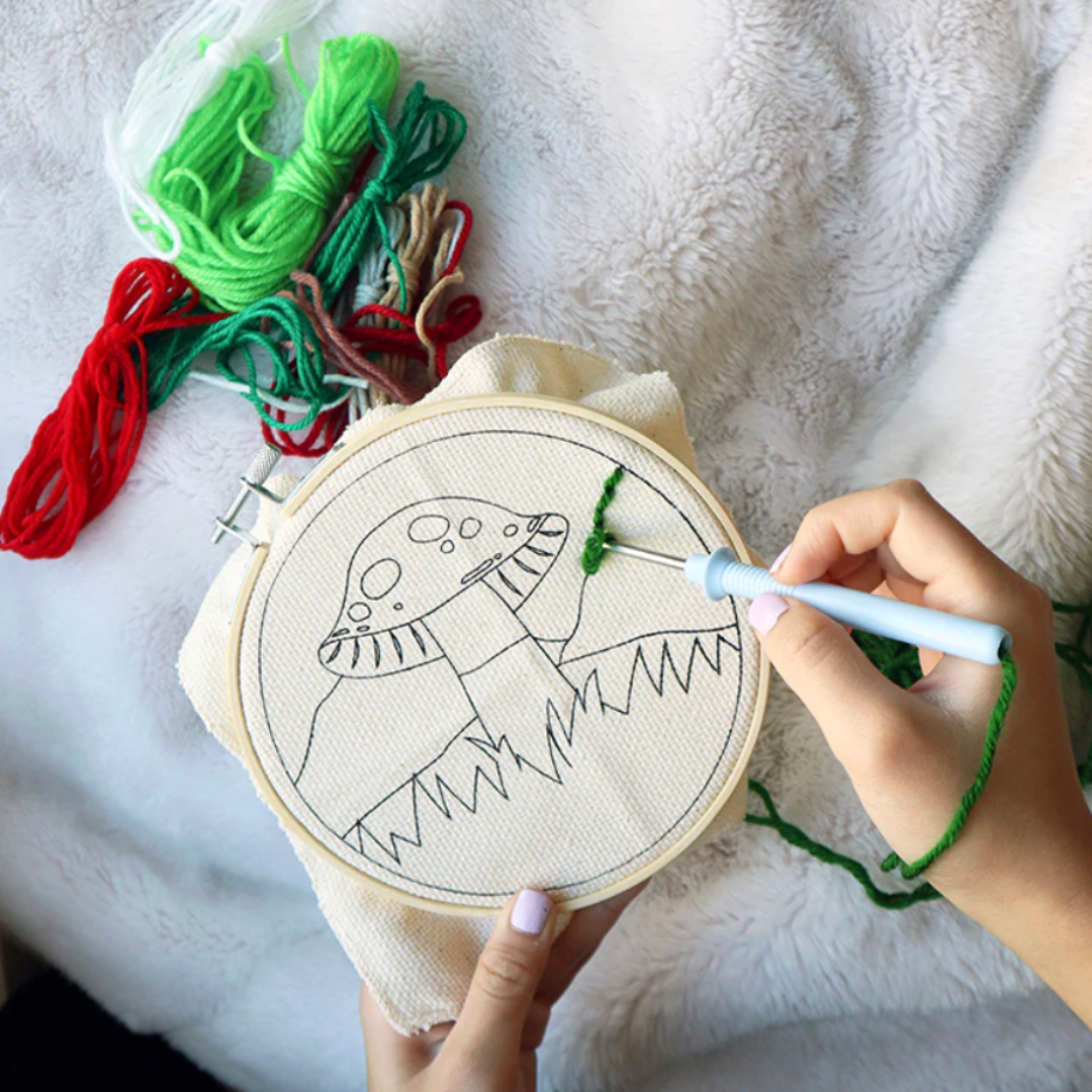 Kit comes with everything needed including: 1 adjustable bamboo hoop, 1 punch needle, 1 needle threader, 1 cotton cloth with printed template, and plenty of yarn to complete the design.