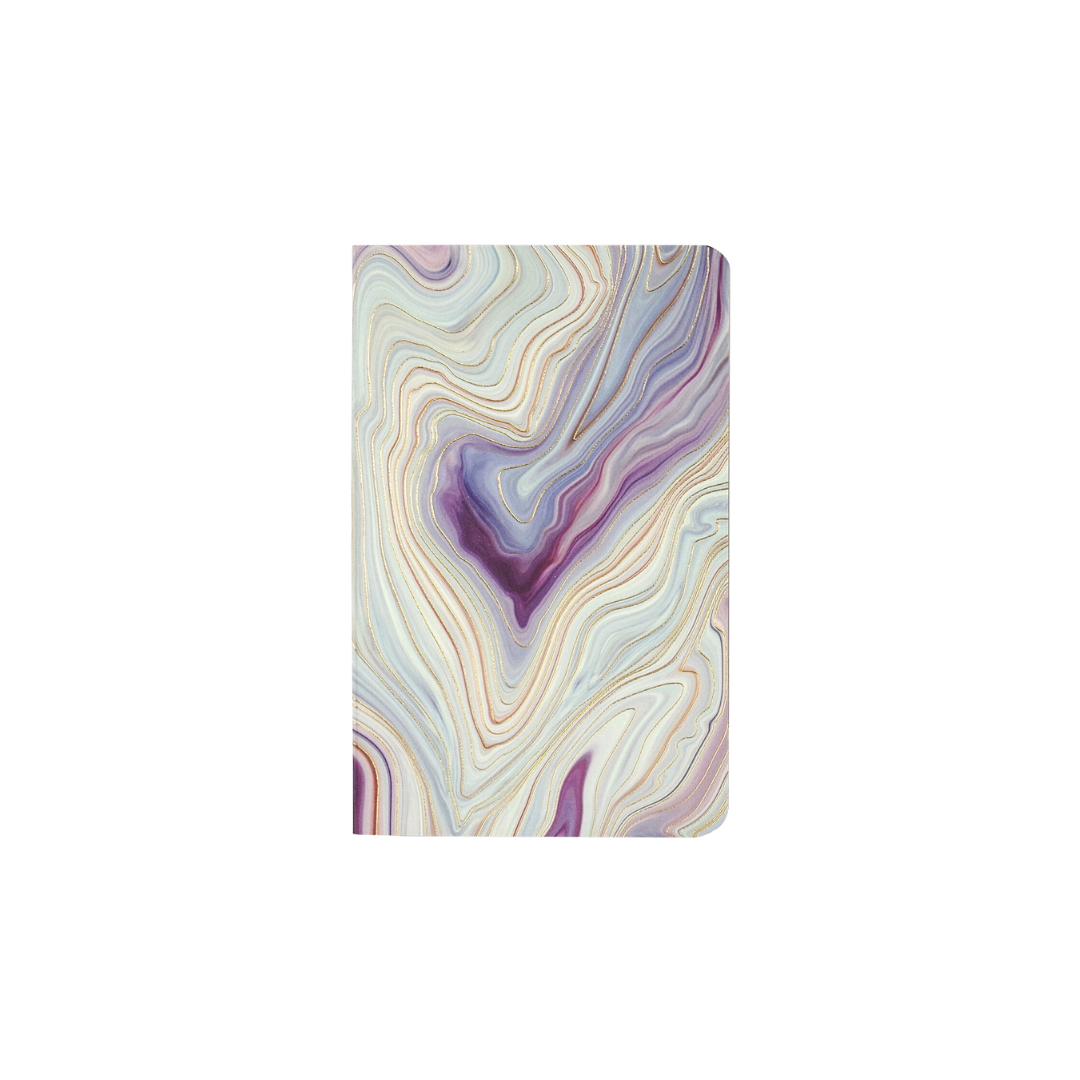 The mini notebooks are available in violet, blue, or coral agate. (Agate is a variegated form of quartz.) The cover of each notebook is embellished with gold foil. The interior of each notebook features a dot-grid pattern for maximum flexibility of use.
