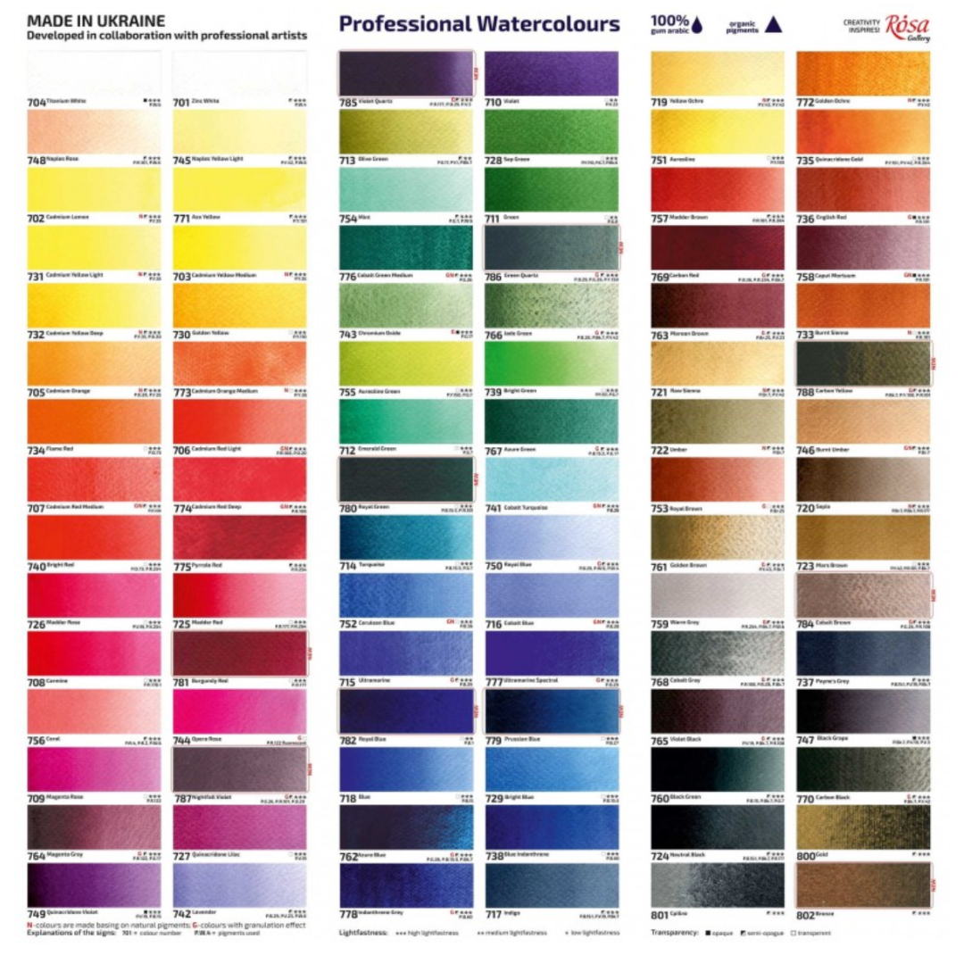 Rosa Gallery is a brand of professional watercolour paints made in the Ukraine by ROSA. These colours are incredibly vibrant, have a high pigment load and use gum arabic as a binder that is very famous for being the best binder for watercolours.