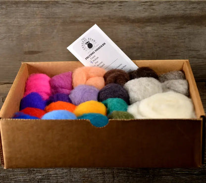 🇨🇦 Canadian Made 🇨🇦 Create your own needle felted sculptures and paintings with our colour pack. Kit includes 20 grams of cream 24 x 5 gram colour bits ( 20 solids, 4 naturals) 4 medium felting needles. Materials needed but not included are a felting pad.