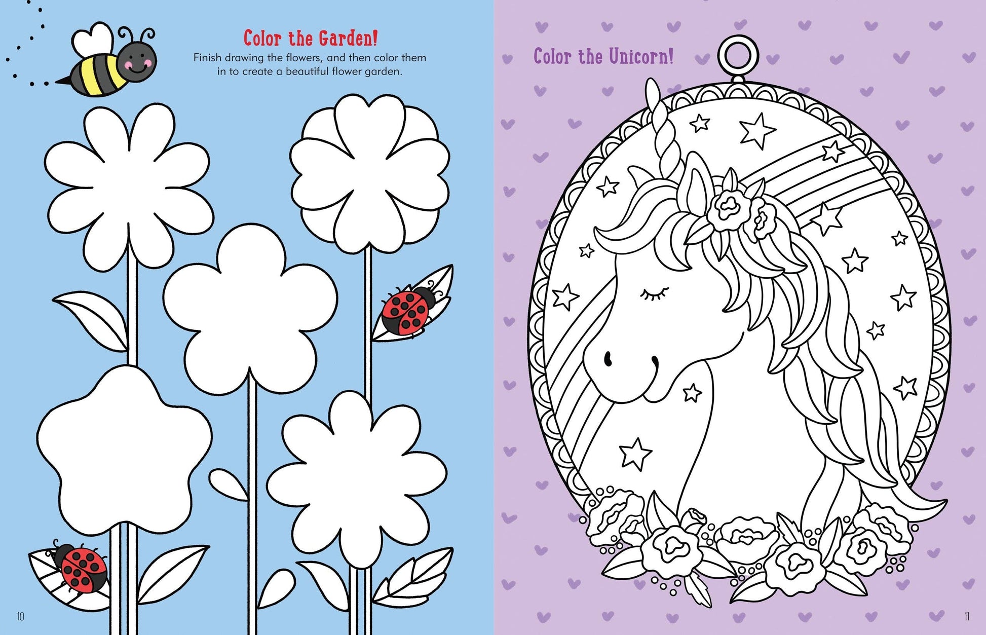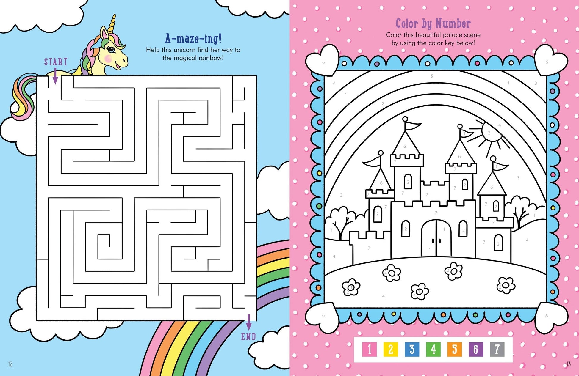It's unicorn fun for everyone! Colourful activity book is filled with unicorn-themed mazes, word searches, coloring, and more. Children will have hours of fun!